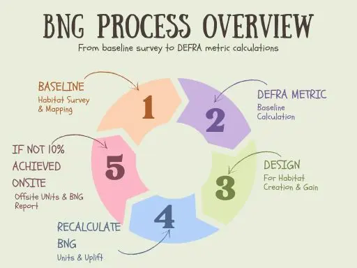 The diagram shows how we move from baseline survey to DEFRA metric calculations, integrated landscape design, BNG reporting and, if needed, offsite units. Each step is designed to keep your project compliant and moving smoothly through planning.